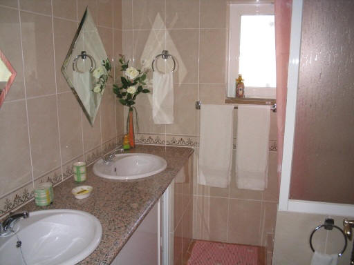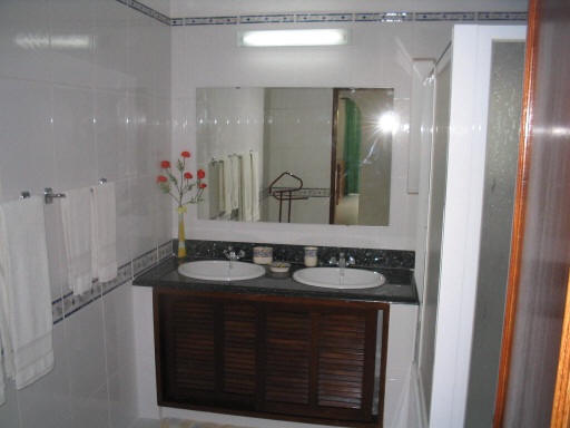 Eerste etage. Hier vindt u een grote - ouder - slaapkamer met kingsize bed en een en-suite badkamer met bad, aparte douchecabine, dubbele wastafel en toilet.